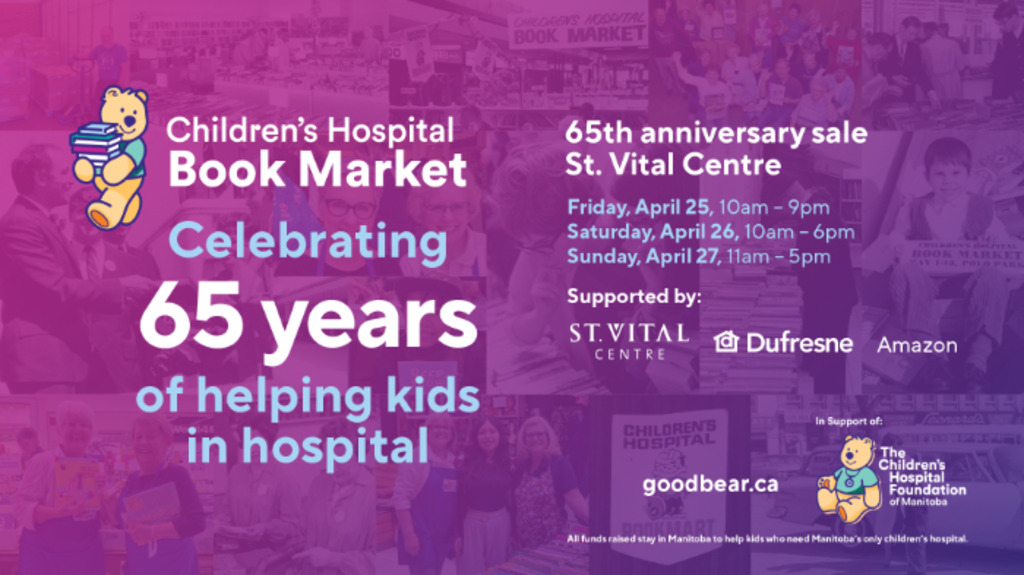 isit St. Vital Centre from April 25 – 27 to shop for great books of all genres and support sick and injured kids in your community at the Children’s Hospital Book Market! All funds raised stay in Manitoba to help kids who need HSC Children’s Hospital.