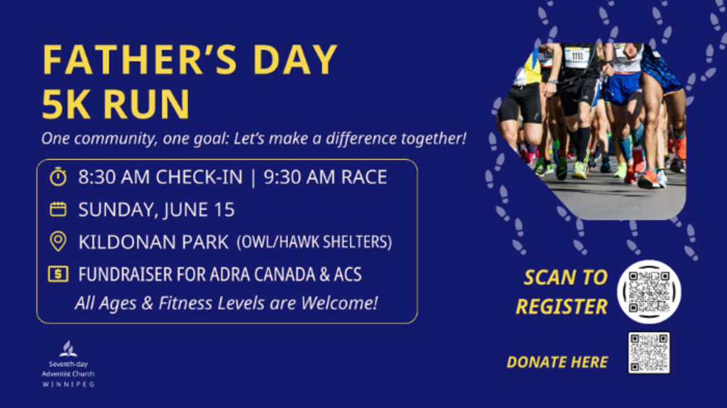 Lace up your running shoes and join us for a Father’s Day 5K Run. Sponsored by the Winnipeg Adventist Health Ministries teams, this fun, family-friendly event is a great way to celebrate the men in our lives while supporting two wonderful causes.