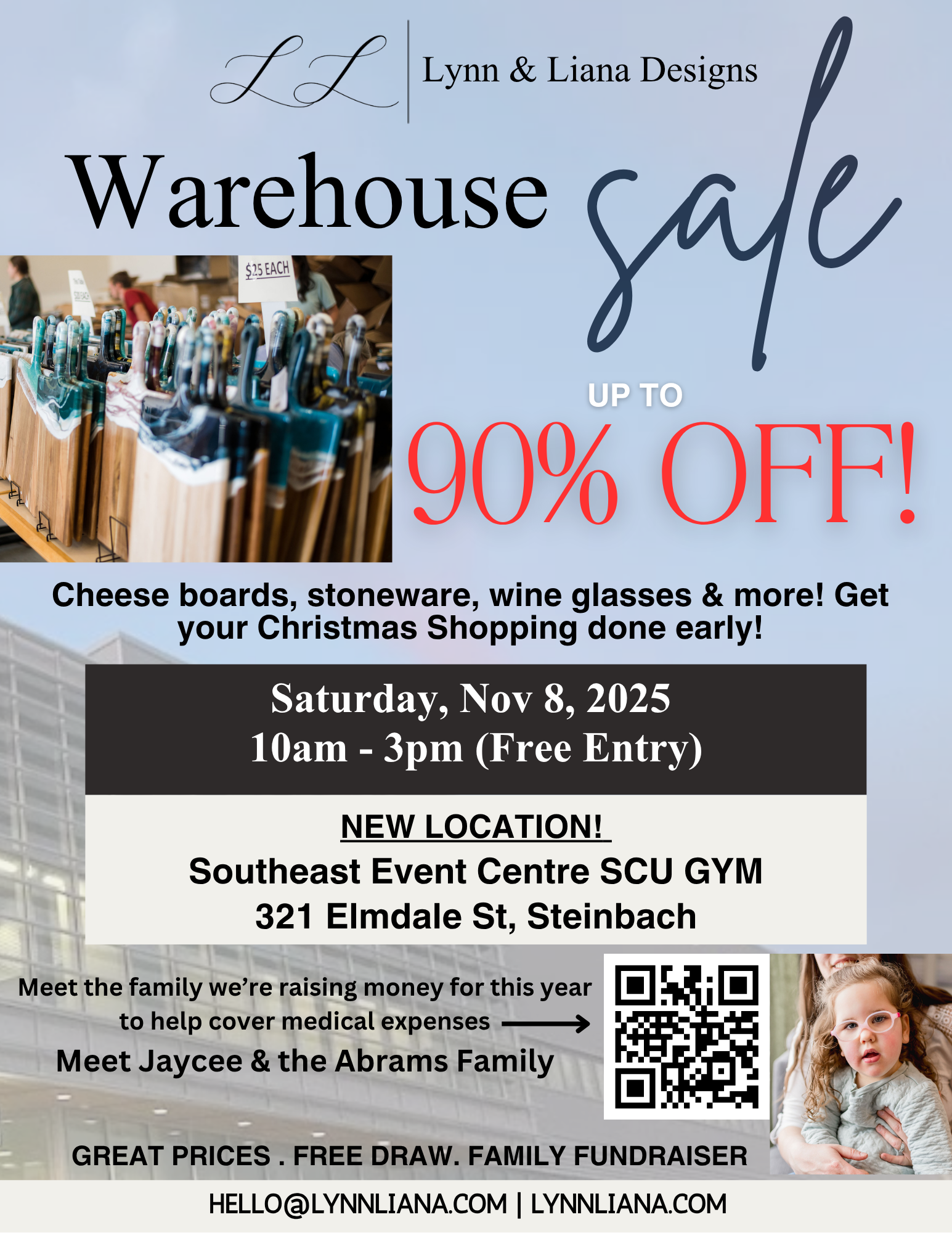 We are thrilled to share this year we are raising funds for a local family here in Steinbach who have been battling many medical expenses to help support their beautiful 3.5 year old Jaycee. The Abrams family have been a part of our local community for many years and it's time to show them our love and support. A portion of our proceeds from our warehouse sale will be donated towards the family, plus, there will be opportunity to donate direct to the family during the warehouse sale event.