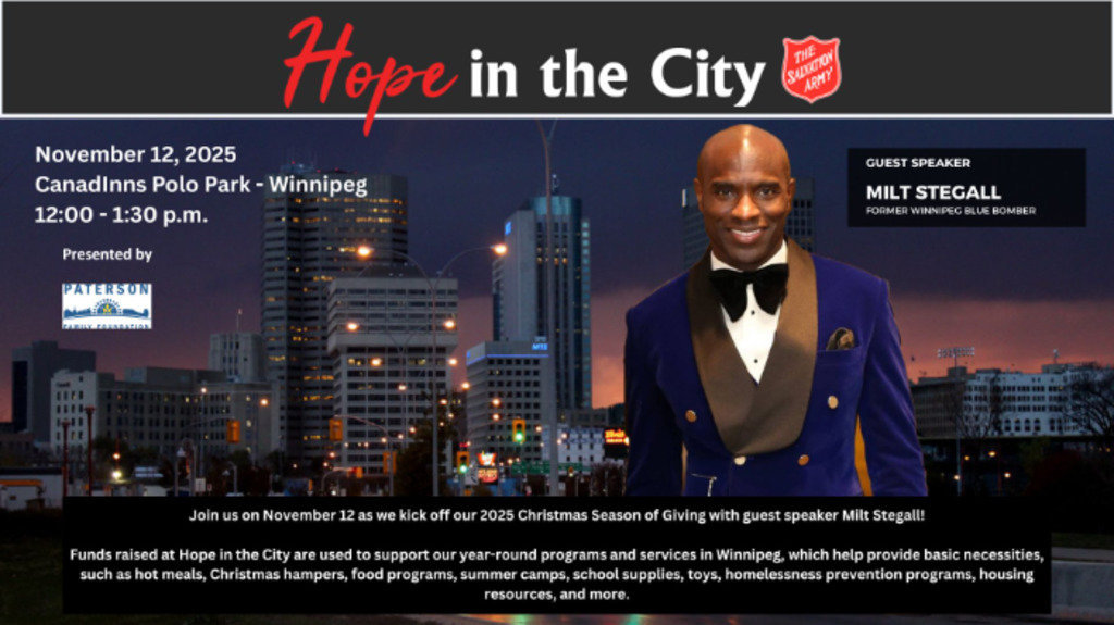 The Hope in the City Winnipeg luncheon is kicking off The Salvation Army’s 2025 Christmas Campaign with guest speaker Milt Stegall! We are so grateful for the opportunity to come together to support The Salvation Army’s incredible work in Winnipeg. Also joining us to emcee the event is CTV’s Maralee Caruso.