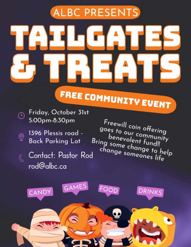 Don't stress about supper on Halloween, make ALBC One of your stops. Grab a hotdog, hot chocolate, coffee, candy and more before, during or after your Trick or Treating!! WE also have a warm up area and some crafts... and it's all FREE!!