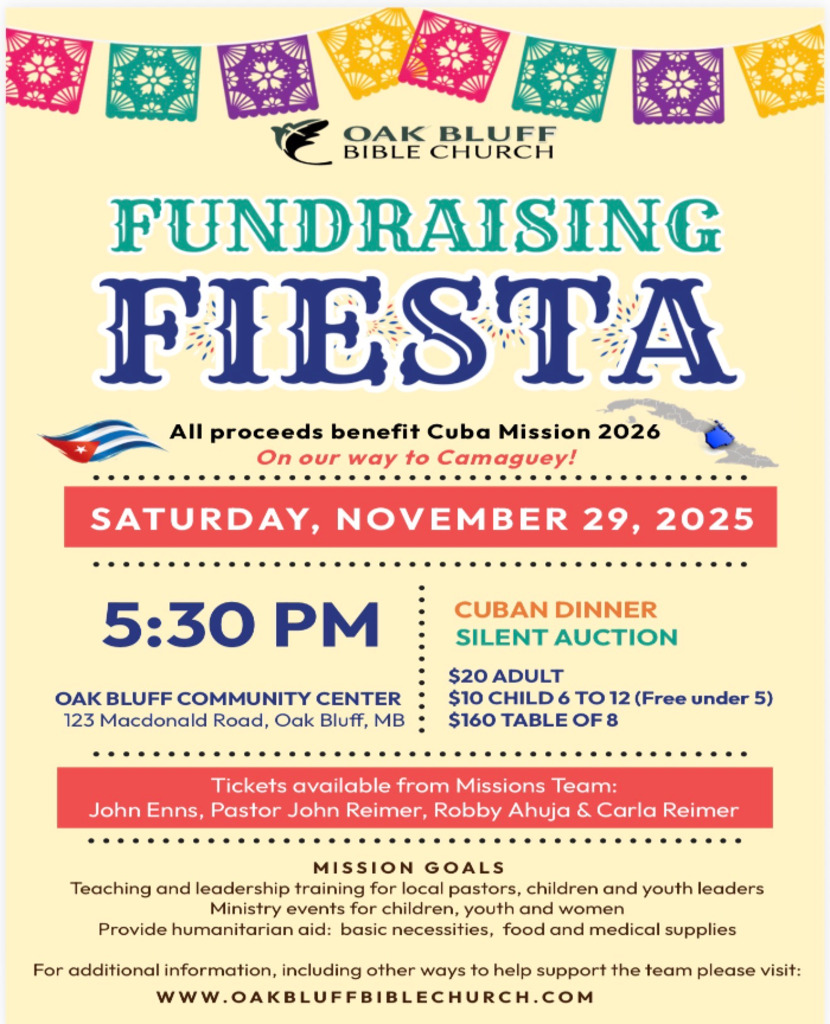 Oak Bluff Bible Church is sending a missions team to Cuba in the first quarter of 2026. To raise funds to support Cuban pastors and families with basic necessities, food and medical supplies, they are hosting a Cuban Fiesta on November 29th at 5:30 at the Oak Bluff Community Centre. There will be a delicious Cuban dinner and silent auction. All donations are tax deductible, contact Robby at 204-557-2457 for more information or to reserve a seat.