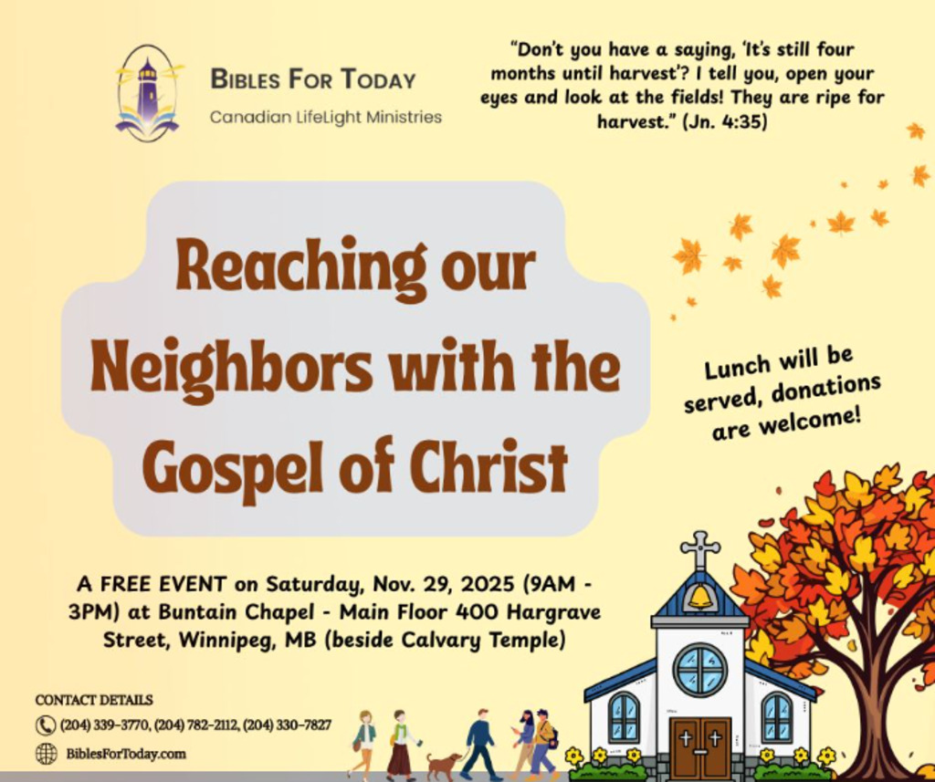 Join us on Saturday, Nov. 29, 2025 from 9:00 am to 3:00 pm at Buntain Chapel (beside Calvary Temple) 400 Hargrave St. Winnipeg, MB.