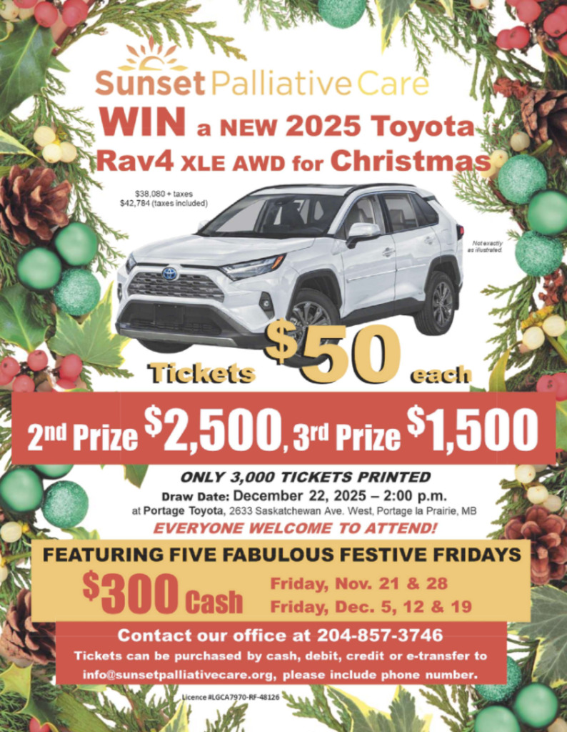 We will have six private rooms dedicated to palliative care in the new hospital along with a rooftop garden, family room and comfort cart. FUNDS RAISED FROM THIS RAFFLE WILL HELP COVER COSTS OF THESE PROJECTS. Your $50 ticket purchase gives you a 1/3000 chance to win Toyota Rav4, plus many other draws. Tickets available at Sunset Palliative Care office or by sending an e-transfer to info@sunsetpalliativecare.org and we'll send you a photo of your ticket. Please include your phone number in the message. For more information contact our office at 204-857-3746.