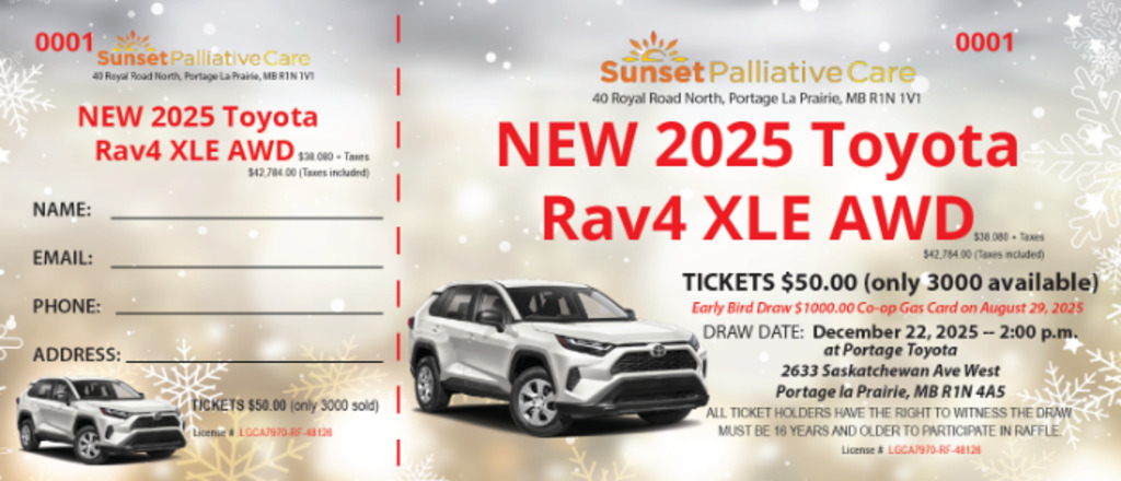 We will have six private rooms dedicated to palliative care in the new hospital along with a rooftop garden, family room and comfort cart. FUNDS RAISED FROM THIS RAFFLE WILL HELP COVER COSTS OF THESE PROJECTS. Your $50 ticket purchase gives you a 1/3000 chance to win Toyota Rav4, plus many other draws. Tickets available at Sunset Palliative Care office or by sending an e-transfer to info@sunsetpalliativecare.org and we'll send you a photo of your ticket. Please include your phone number in the message. For more information contact our office at 204-857-3746.