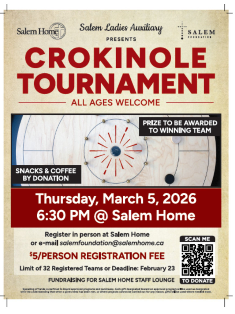 On Thursday, March 5, 2026 at 6:30 pm the Salem Ladies Auxiliary are excited to once again host their “ Crokinole Tournament” Fundraiser at Salem Home (165 15th St, Winkler). The Registration fee is $5/player (2 players/team), all ages are welcome; limit of 32 teams, with registration deadline by February 23th. Teams will need to collect pledges with proceeds to go towards Salem Staff Lounge. Snacks and drinks will be available by donation and prizes will be awarded. Come on out, cheer on your team!