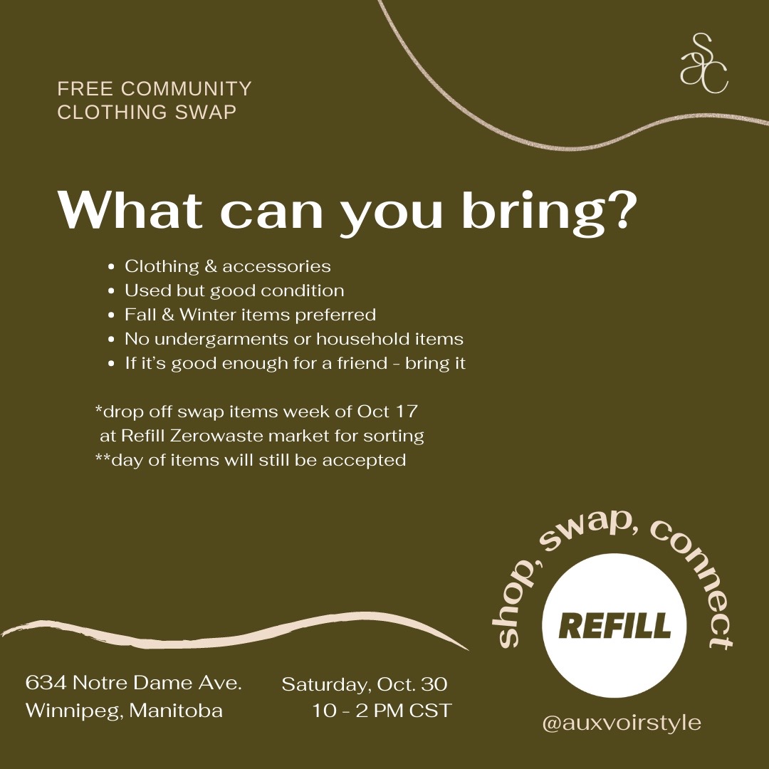You’re invited to the Auxvoir Style Swap, a free community clothing swap at Refill Zerowaste Market on Saturday, October 30, 2021 from 10-2 PM CST.